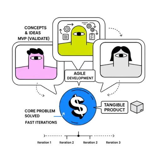 Turn concepts into tangible products or solutions. Start with MVP (Minimum Viable Product) to validate assumptions. Prioritize agile development and fast iterations. Emphasize simplicity and solving the core problem first.
