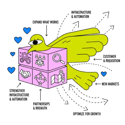 Expand what works—products, teams, and markets. Strengthen infrastructure, automation, and processes. Double down on customer acquisition and retention. Build partnerships, enter new markets, and optimize for growth
